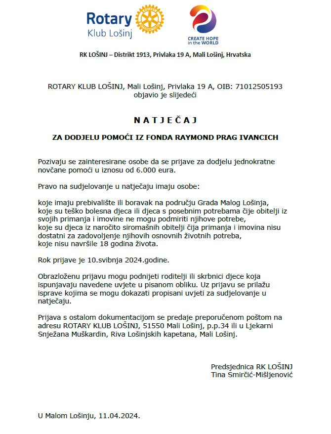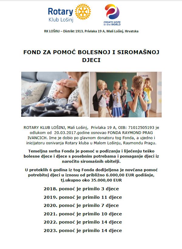 U svojoj dvadesetoj godini postojanja, lošinjski Rotary klub objavio je natječaj za dodjelu pomoći iz fonda Raymond Prag Ivancich! Kroz ovaj fond pomže se djeci do osamnaest godina starosti s područja Grada Malog Lošinja, a koja su teško bolesna djeca ili djeca s posebnim potrebama čije obitelji iz svojih primanja i imovine ne mogu podmiriti njihove potrebe! Kroz ovaj fond, do sada se pomoglo šezdesetak djece. Raymond Prag Ivancich istaknuti je rotarijanac, rođeni lošinjan, a koji je kao dijete otišao u Ameriku i tamo ostvario izuzetne poslovne i privatne uspjehe. Na ovaj se način želi odužiti svom mjestu i pomoći socijalno ugroženoj djeci rodnog otoka!