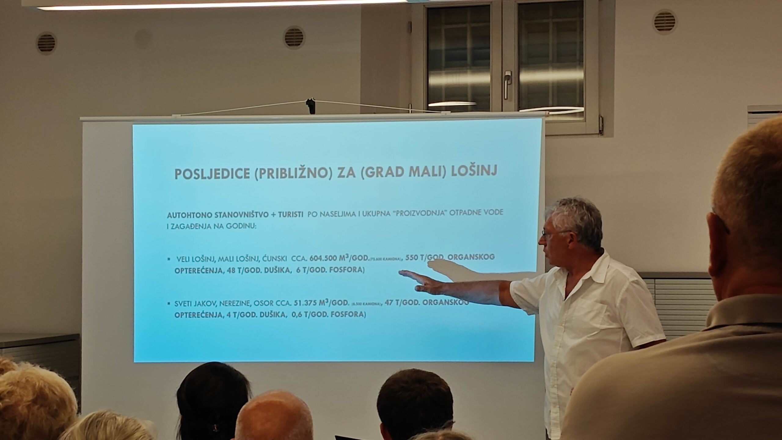 Novoosnovana Udruga za očuvanje bioraznolikosti – Anima Lošinj, održala je javnu tribinu na temu „Hoće li lošinjski kanal postati bazen fekalija?“. Predavač je bio magistar znanosti Petar Opić, međunarodni stručnjak za integralno gospodarenje vodama. Na tribinu se odazvalo pedesetak građana, a prostor male sale Gradske knjižnice bio je pretjesan! Nakon uvoda, u kojem je predavač usporedio more u kanalu nekada i danas, razvila se rasprava o sustavima pročišćavaanja otpadnih voda našeg arhipelaga. Velik je broj gostiju u ljetnim mjesecima i u kratkom roku se „proizvede“ puno otpadnih voda. Dosadašnji kanalizacijski sustav „prvog stupnja“, samo je kroz rešetku odvajao krupniji sadržaj od tkućeg. Ulaskom u Europsku uniju, obvezali smo se na postavljanje Eu-zaknodavstvom određene stupnjeve pročišćavanja. Upravo zato, s osamdesetak posto sredstava Europske unije izrađuje se „Aglomeracija“. Po završetku radova koji se očekuju koncem slijedeće godine, na ispustu na Kijcu, ispuštat će se tzv. „tehnološka voda“, pročišćena drugim stupnjem. Na ispust na Kijcu, bit će spojeni Veli Lošinj, Ćunski, Sunčana uvala i Čikat. U isto vrijeme, Osor, Nerezine i Sveti Jakov s kampovima i turističkim naseljima spojit će se na ispust u Nerezinama, a koji će po zavšetku imati prvi stupanj pročišćavanja (naime, zakonodavstvo i pravilnici predviđaju za određene brojeve korisnika različite vrste stupnjeva pročišćavanja).