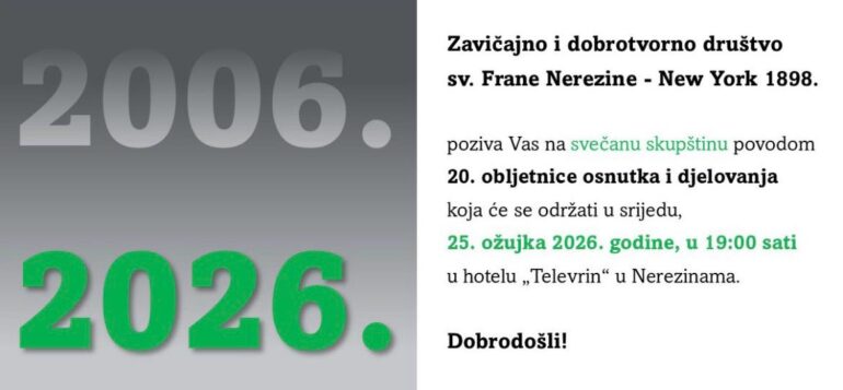 Zavičajno i dobrotvorno društvo svetog Frane Nerezine New York 1898. poziva na svečanu skupštinu povodom 20. obljetnice djelovanja.